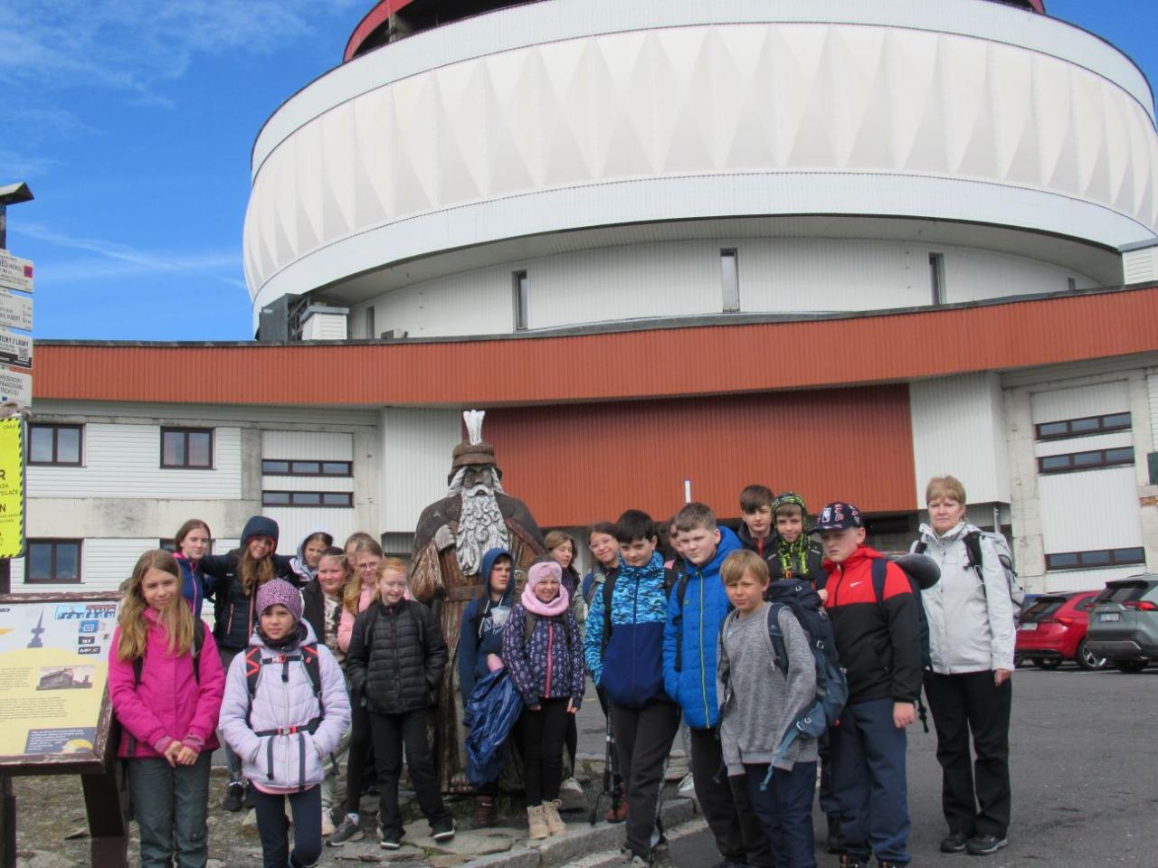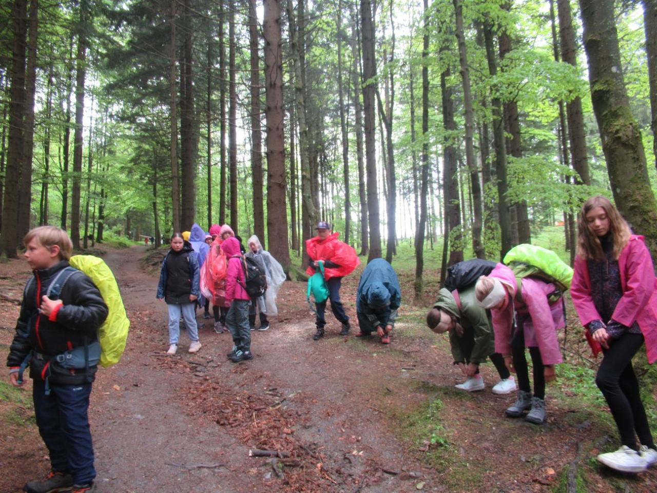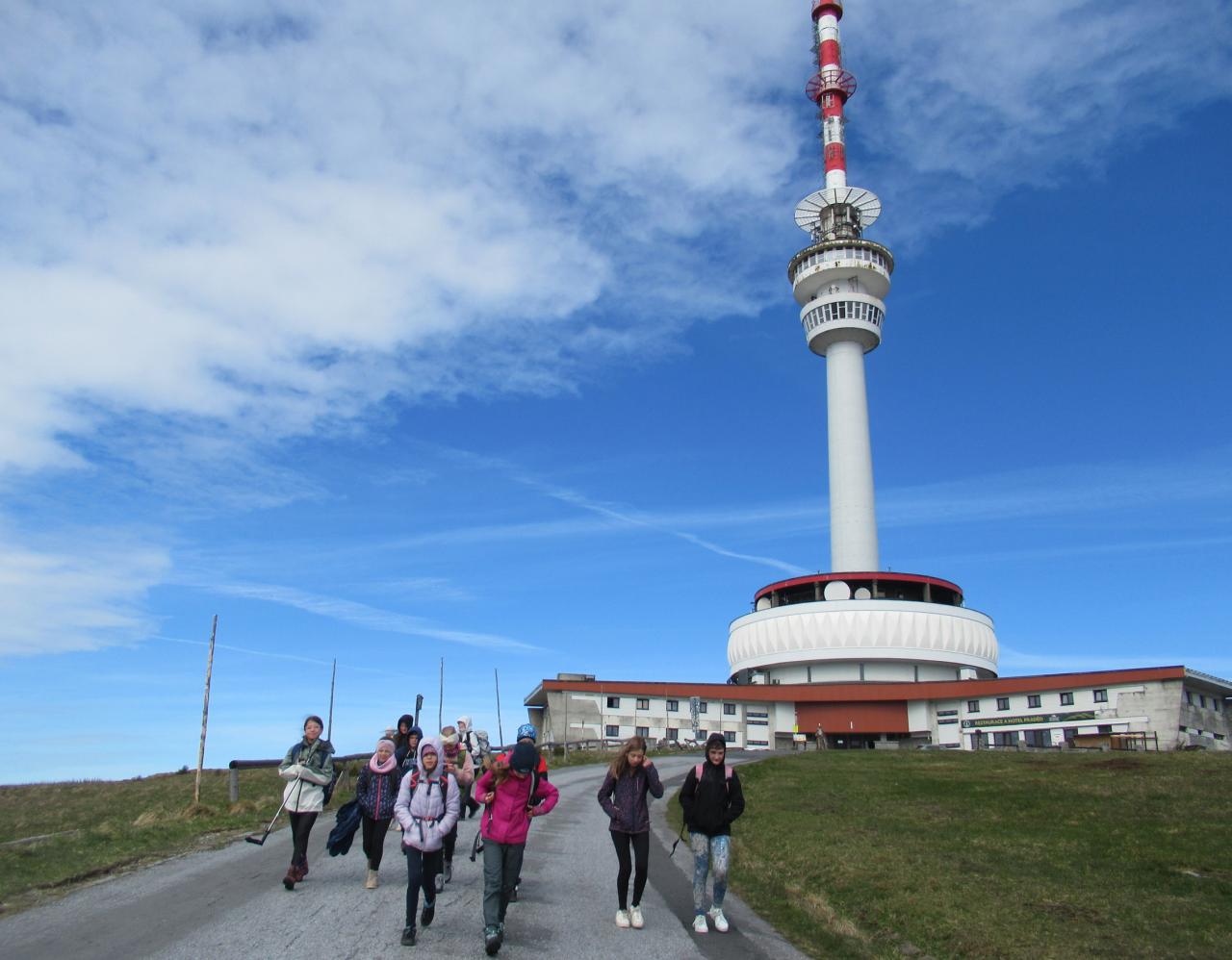 Déšť nás však v různé intenzitě provází celým dnem :-( Nevadí, některé to zmáhá, ale většinou se těšíme na další zážitky. Z vyhlídky Rolandův kámen scházíme do lázeňského městečka Karlova Studánka, kde nás čeká autobus a pokračujeme do Bělé pod Pradědem na Vysoký vodopád. Stále lije, ale nevzdáváme to. Před vrcholem některým „dochází síly“ a k vodopádu se vydává jen 8 statečných. Ale je to krása, stálo to za to! Osvěženi horským pramenem se vydáváme zpět a cestou přibíráme zbytek kamarádů. A hurá na oběd, sice pozdní, ale teplý! Stezku kolem vodopádů Bílé Opavy pro tentokrát z našich plánů „vypouštíme“ a chystáme se k vrcholu Jeseníků, Pradědu, na ubytování. Vezeme se autobusem. Konečně jsme na vrcholu! Čeká nás teplý čaj, sprcha a postele. Po zábavném programu, který jsme si pro ostatní kamarády ve skupinkách připravili, už si jen povídáme a chystáme se k odpočinku.