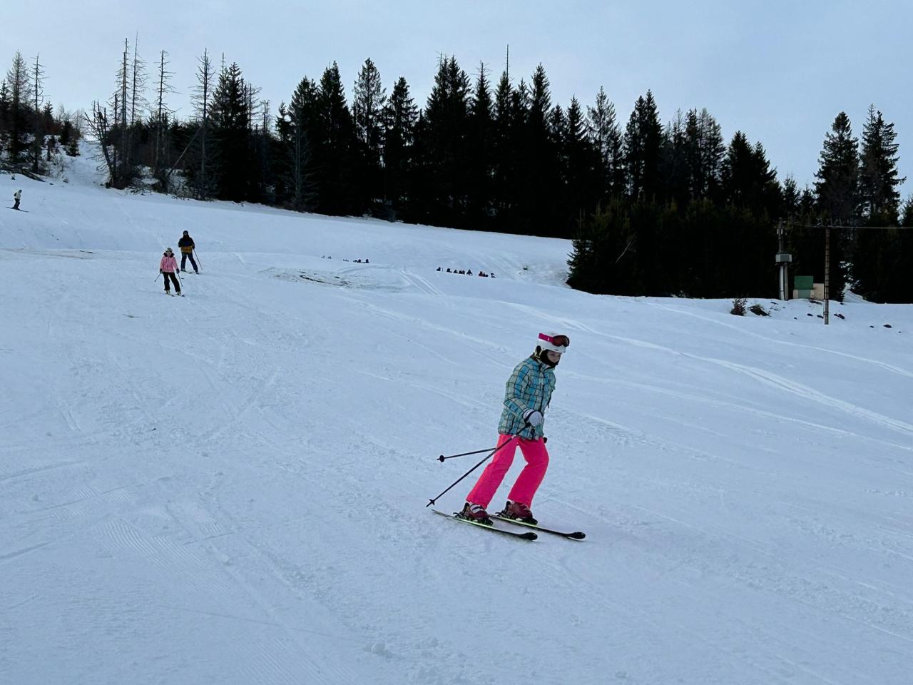 především pluh a udržování rovnováhy (docela rychle zjistili, že lyže po sněhu kloužou), zatímco pokročilí pilovali techniku jízdy. Každý se snažil zdokonalit a posunout své schopnosti dál.