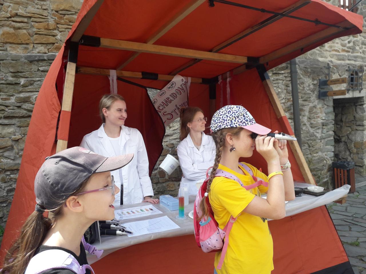 Poslední částí výletu byla návštěva Slezskoostravského hradu, kde právě probíhala akce Chemie na hrad. Děti si zde mohly vyzkoušet nejrůznější jednoduché chemické, přírodovědné a fyzikální pokusy, luštit hlavolamy, tvořit v dílničkách a sledovat ukázky složitějších experimentů. Nechyběly ani soutěže s možností získat sladkou odměnu.