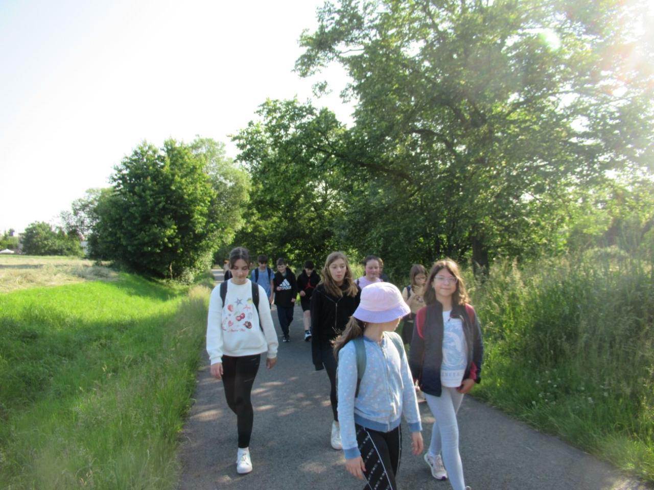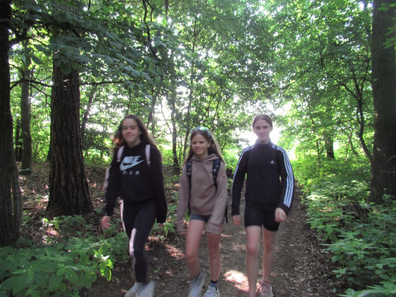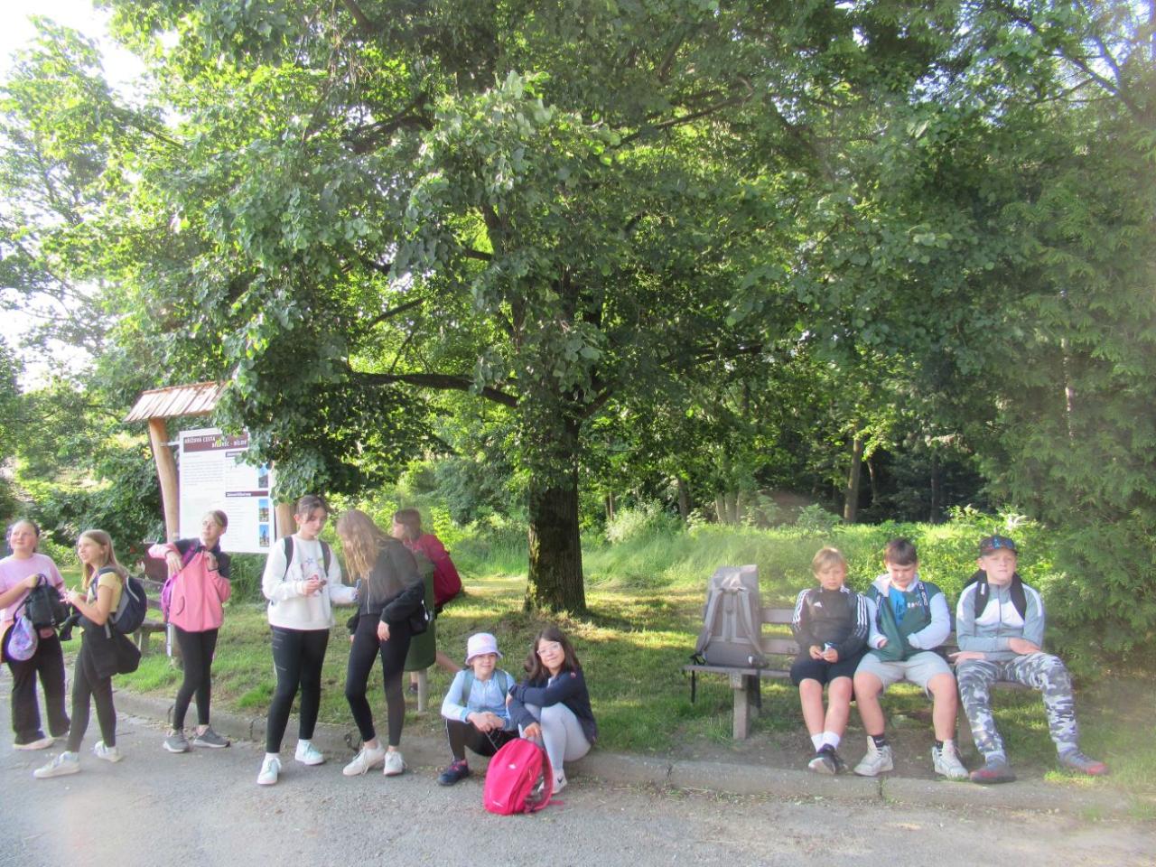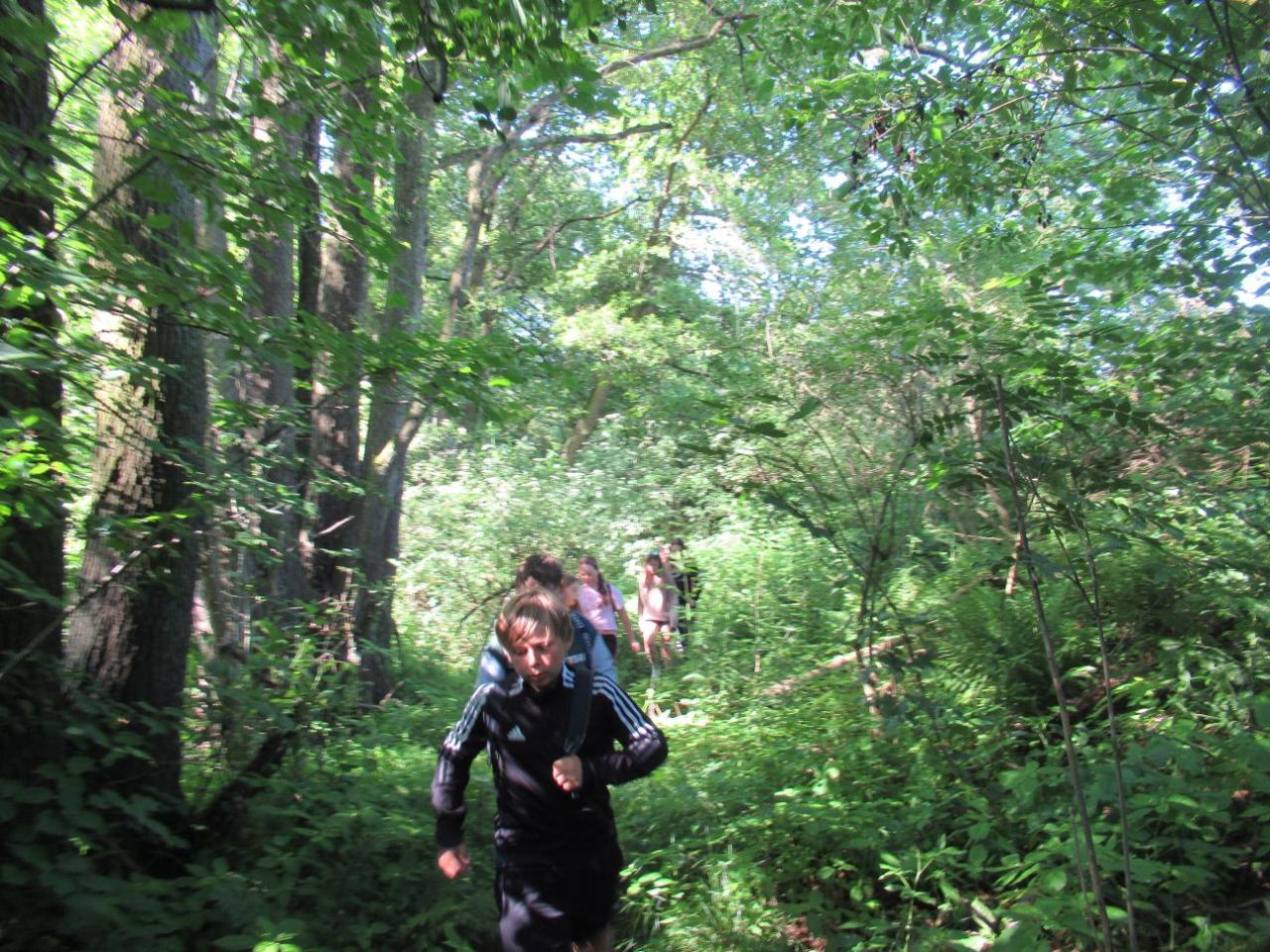 „Je to tady? Je tu napsáno soukromý pozemek,“ přemýšlejí někteří u Zámečku. „Co myslíte vy?“ reaguje paní učitelka, a dovídáme se, že pokračujeme ještě kousek – prý k jezírkům nahoře v lese. Od jezírek se již lesní cestička svažuje dolů, což některé nápadně zrychlí a musejí se kousek vracet, neboť my ostatní odbočujeme vpravo.